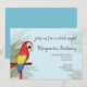 Este diseño presenta una fiesta de animales de aves silvestres lindas, código QR de redes sociales en línea, con información de RSVP de eventos de Facebook, una fiesta al aire libre junto a la piscina de una playa tropical, un loro de la selva colorido y vida silvestre linda, un minimalismo simple y moderno, una caligrafía elegante y de moda, una hoja de palma botánica, un follaje verde tropical, invitaciones de fiesta divertidas y caprichosas.