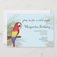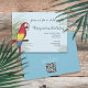 Este diseño presenta una fiesta de animales de aves silvestres lindas, código QR de redes sociales en línea, con información de RSVP de eventos de Facebook, una fiesta al aire libre en una piscina de playa tropical, un loro de jungla colorido y vida silvestre linda, un minimalismo simple y moderno, una caligrafía elegante y de moda, una hoja de palma botánica, un follaje verde tropical, invitaciones de fiesta divertidas y caprichosas.
