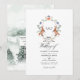 Invitación de boda con una caprichosa cresta temática de bosque que se puede personalizar con las iniciales de la pareja. El código QR en el reverso dirige a su sitio web de boda donde la gente puede obtener más información y responder.