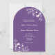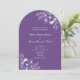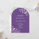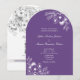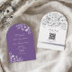 Esta elegante invitación de boda con arco presenta un fondo morado moderno combinado con delicado arte lineal floral blanco y una clásica tipografía serif. El diseño incluye un diseño completo sin fotos en la parte frontal con los detalles de su ceremonia, más una parte posterior coincidente con un código QR para RSVP y un enlace al sitio web de la boda para un fácil acceso de los invitados.
