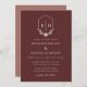 Invitación a la Boda Botánica Monograma Borgoña. El frente tiene un hermoso monograma floral y verde con un texto de invitación formal