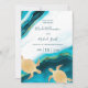 Dos tortugas doradas sobre un fondo verde azulado de tinta dorada. Elegante carta de invitación a la boda en la playa. Con los detalles y un escaneado código qr para el sitio web de su boda al revés.