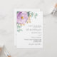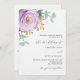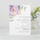 Un fondo blanco. Decoradas con flores violetas, violetas, rosas y hojas de eucalipto de color verde acuático, estribillos, vegetación y una imitación de las bromas de oro. Personaliza y agrega tus nombres y detalles. Atrás: agregue la URL de su sitio web boda al código QR para obtener más detalles y/o RSVP.