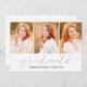 Tarjeta fotográfica manuscrita de collage de guiones invitando a su familia y amigos a la fiesta de graduación de su hija. Fondo blanco del guión de Relieve metalizado plateado falso. Diseño de Elke Clarke. Visite nuestra tienda www.zazzle.com/monogramgallery* para más diseños y estilos. Añade tus propias fotos y texto.