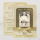 Esta invitación creativa para el 50º aniversario tiene un aspecto antiguo de antaño. El diseño de la parte frontal presenta un marco rodeado de una imagen realista de encaje y resaltado con imágenes de acentos de estrás tonificados en oro. Reemplace la foto de muestra con su propia foto utilizando la plantilla fácil proporcionada. Debajo de la foto hay una imagen de un lazo de cinta de purpurina dorada falsa y todo está colocado sobre un fondo que simula pergamino antiguo y correspondencia vintage. Personalice la parte frontal con los años de aniversario (como se muestra) o los nombres de la pareja. Dos líneas de texto en la parte inferior también son personalizables. El reverso presenta la misma imagen de correspondencia antigua. Reemplace el texto de muestra con los detalles de su evento utilizando las plantillas proporcionadas.