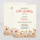 Celebrate a milestone with this colorful Wildflower themed 50th birthday invitation, set on a soft yellow background that feels warm and joyful. A charming border of cute wildflowers in soft orange and yellow blooms along the bottom of the card, accented with buzzing bees and a delicate butterfly. The word “50th Birthday” is written in a beautiful script font in a coordinating floral color, while the party details are styled in a mix of elegant script and classic serif fonts for a balanced, whimsical look. The design is easy to customize with your own celebration details, and the back of the card features the same floral artwork with a lovely string of butterflies fluttering up from the flowers for a magical finishing touch.