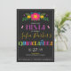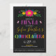 Invitación de fiesta de Quinceañera mexicana con flores alegres y coloridas sobre un fondo gris oscuro.