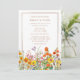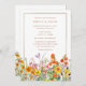 Las invitaciones a la boda campestre de las flores silvestres coloridas presentan flores de campo de bonito en naranja, amarillo, morado y rosa sobre un fondo blanco con la información de la invitación a la boda. Personalice editando el texto en los cuadros de texto. Diseñado por Evco Studio www.zazzle.com/store/evcostudio