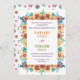Una invitación a una boda vibrante con un colorido borde floral con tonos naranjas, morados, azules y amarillos. Su diseño alegre y lúdico es perfecto para bodas de verano o de temática tropical, añadiendo calor y energía a su boda especial.