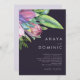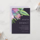 Este colorido trópico tradicional | la invitación a la boda púrpura es perfecta para tu moderno destino boho, boda verde, púrpura y melocotón. El diseño cuenta con un elegante ramo de vegetación acuática clásica y flores que pueden incluir eucalipto verde salado, protea malva y roja, hibiscos rosa rubor, ave paradisíaca naranja y azul, y hojas de palmera verde oscuro. El diseño es ideal para un boda de viajes sencillo, creativo y único para primavera, verano, otoño o invierno. Encontrará otro papel de boda que coincida o coordine el resto de la colección.
