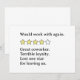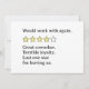 Esta sincera resalta el fuerte trabajo en equipo y espíritu de colaboración de un trabajador, y deja constancia que serían bienvenidos en futuros proyectos. Sin embargo, critica su aparente falta de lealtad, enfatizando la decepción por su partida. La reducción de una estrella refleja el impacto emocional de su salida más que el desempeño profesional. Ideal para discusiones sobre la dinámica del lugar de trabajo, la retención de empleados o el equilibrio entre relaciones personales y profesionales. El tono es informal pero revelador, y ofrece una visión de cómo los colegas valoran la confiabilidad y la camaradería en espacios de trabajo compartidos.