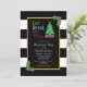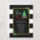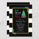 Coma, bebe y sé feliz la invitación de la soltera navideña con un árbol de Navidad y regalos contra un marco dorado. Fondo rayado blanco y negro con fondo hueco