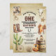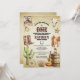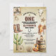 Ensilla y únete a sus invitados para una divertida fiesta de cumpleaños de vaquero al estilo occidental. Un fondo de pergamino acristalado muestra elementos de una fiesta de cumpleaños de rodeo perfecta, incluyendo un cactus, guitarra, rueda de vagón, botas de vaquero, silla, algas podridas y mucho más! Los adornos de estilo occidental decoran la invitación para crear un tema único para un primer cumpleaños u otras fiestas de cumpleaños de edad. Disponible con productos a juego.