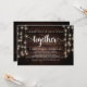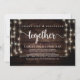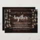 Comparte la felicidad juntos, Tarjeta de anuncio / invitación de boda clandestina, en madera rústica de granja, diseño de luces de cuerda. Esto es perfecto para tu recepción de boda y fiesta de celebración después de la boda. Agrega tus detalles en la fuente / letra coincidente.