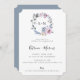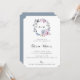 Elegante corona floral acuática, invitación a la fiesta de compromiso. El diseño de la tarjeta está decorado con flores y follaje azul, malva y blanco polvorientos. Monograma de floral y elegante diseño de plantilla de tipografía. La parte posterior de la tarjeta, mostrada en azul polvoriento, se puede personalizar.