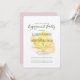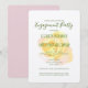 Comience a celebrar su próxima boda con esta invitación a la fiesta de compromiso de la hermosa rosa amarilla con una rosa amarilla sonrojada centrada detrás de los detalles de la fiesta en la parte delantera y un rosa polvoriento en la parte trasera. Esta invitación utiliza una fuente tipográfica simple y limpia de color verde oscuro impresa a mano para el texto de los detalles, una fuente tipográfica manuscrita y bonita con remolinos en verde más oscuro para "Fiesta de compromiso" y una fuente tipográfica manuscrita alta y coordinada para sus nombres. La imagen destacada de la rosa es una pintura digital original de Dogwood & Thistle.