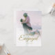 Una fotografía sencilla con un guión moderno y elegante que anuncia tu compromiso sobre la parte superior. La foto se cambió fácilmente a tu propia foto personal. El texto al revés se cambia fácilmente por el suyo propio y está en un fondo blanco. La foto de la parte de atrás puede ser intercambiada por usted mismo y también aparecerá desvanecida.