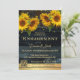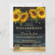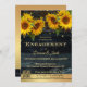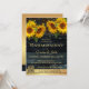 Una invitación festiva a participar en una fiesta de diseño con girasoles y destellos de luz sobre un bosque rústico y metalizado fondo verde oscuro con forro dorado. Hermoso para una celebración de otoño o otoño. El texto de "Compromiso" es una imagen estilizada y se puede borrar si lo prefiere. También puede reemplazar la parte posterior con la foto de su personalizado si lo desea.