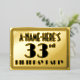 El frente de esta invitación a Relieve metalizado de 33 años inspirada en la celebración de los 2000 Roaring inspiró un nombre de personalizable, un gran estilo Art Deco inspirado número "33", el mensaje "PARTIDO DE CUMPLEAÑOS" y un patrón fronterizo consistente en líneas. En la parte posterior se incluyen detalles personalizados sobre el evento, como la fecha, la hora, la ubicación/lugar y cualquier otra información que pueda ser importante. Invitaciones lujosas, elegantes y editables como estas podrían ser usadas para invitar a los invitados a una reunión/fiesta de cumpleaños que se lleva a cabo en celebración del 33 cumpleaños de alguien. [~Z0000592]