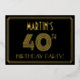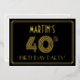 La fachada de esta inspirada celebración de 40 años al estilo de los años 1920-1930/invitación al Relieve metalizado fiesta incluye un nombre personalizado, un gran estilo Art Deco inspirado número "40", el mensaje "¡FIESTA DE CUMPLEAÑOS!" y un patrón fronterizo compuesto de líneas. Hay un fondo de color negro en el frente de forma predeterminada, pero se puede personalizar a un color diferente si se desea. La parte posterior incluye detalles personalizados sobre el evento, como la fecha, hora, ubicación y cualquier otra información que pueda ser relevante. Elegantes, lujosas y editables invitaciones como estas podrían ser usadas para invitar a los invitados a una celebración/fiesta de cumpleaños que se lleva a cabo para celebrar el 40 cumpleaños de alguien. [~Z0000590]