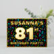 La parte delantera de este vibrante y alegre diseño de tarjeta de invitación para Relieve metalizado de 81 años/fiesta de cumpleaños incluye un nombre editable, un gran número "81", el mensaje "¡FIESTA DE CUMPLEAÑOS!" y una frontera. El fondo del frente tiene un patrón llamativo y multicolor de símbolos musicales. En la parte posterior se incluyen detalles personalizados sobre el evento, como la fecha, hora, lugar/ubicación y cualquier otra información útil. Invitaciones a personalizables como estas pueden ser una manera divertida de invitar a asistentes/invitados a una reunión de cumpleaños que se lleva a cabo en celebración del cumpleaños 81 de alguien. Esto podría ser más significativo si esa persona es un compositor, un cantante, un músico, un compositor o le gusta escuchar música. [~Z0000601]