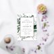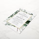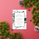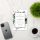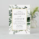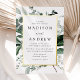 Elegantes invitaciones nupciales con detalles bodas enclavados dentro de un marco rectangular de Relieve metalizado dorado rodeado de eucaliptos, helechos y otros ricos paisajes. Las invitaciones botánicas modernas se invitan a un sólido fondo verde oscuro. Diseñado para coordinar con nuestra colección Abundant Greenery boda.