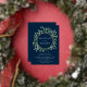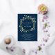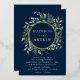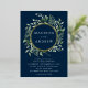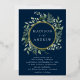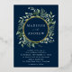Elegantes invitaciones nupciales con nombres rodeados de Relieve metalizado dorado con hojas de eucalipto, frentes de helecho y otros ricos paisajes en un fondo marino. Personalice las invitaciones a la boda de Relieve metalizado de oro añadiendo a continuación los detalles de su boda. Las invitaciones botánicas modernas a la boda revierten a un sólido fondo azul marino. Diseñado para coordinar con nuestra colección Abundant Greenery boda.