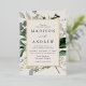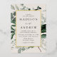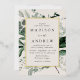 Elegantes invitaciones a bodas con detalles bodas escondidos en un marco rectangular de Relieve metalizado dorado rodeado de eucaliptos, helechos y otros ricos paisajes de color crema. Las invitaciones botánicas modernas se invitan a un sólido fondo verde oscuro. Diseñado para coordinar con nuestra colección Abundant Greenery boda.