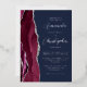 El borde izquierdo de esta elegante y moderna invitación a la boda incluye una acuarela de color burdeos bordeada por un falso purpurina de plata. El texto de personalizable combina guiones y sans serif en Relieve metalizado plateado real sobre un fondo azul marino. El reverso presenta un diseño de agate que coincide.