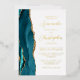 El borde izquierdo de esta elegante y moderna invitación a la boda incluye un verde azulado borde de ágata azul azul con falso purpurina de oro. El texto de personalizable combina secuencias de comandos y sans serif en Relieve metalizado oro real sobre fondo blanco. El reverso presenta un diseño de agate que coincide.