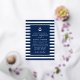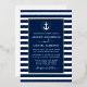 Moderna y elegante invitación de boda con ancla náutica. Ancla blanca con anillo de lámina dorada alrededor. Fondo azul marino. Rayas azules y blancas. Marco de lámina dorada.