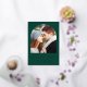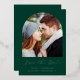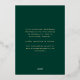 Esta sencilla y minimalista tarjeta Save the Date incluye un arco fotográfico sobre las palabras "Save the Date" en un elegante guión de escritura a mano de Relieve metalizado dorado, seguido por los nombres de la pareja, la fecha boda y la ciudad en letra sans serif sobre un fondo verde esmeralda. Añada un mensaje más detallado con información adicional sobre la marcha atrás.