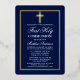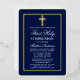 Elegante invitación a la comunidad azul de la marina y oro por primera vez sagrada con cruz. Marco de Relieve metalizado dorado. Cruz de Relieve metalizado dorado. Bordes redondeados. Foto de vuelta.
