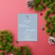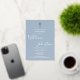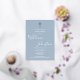 Una elegante invitación de bautizo con una firma de nombre en letra cursiva chic y un crucifijo de pan de oro. Personalice con la información especial de su bautizo en letra chic sobre un fondo azul polvo. Diseñado por Thisisnotme©