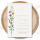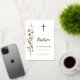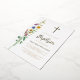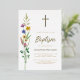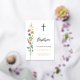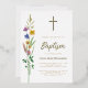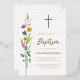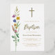 Esta invitación floral al Relieve metalizado de oro del Bautismo incluye flores silvestres y una cruz con una tipografía elegante de escritura dorada. Personalizable fácil. Acuarela original © Michele Davies.