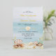 Perfecto para bodas de destino tropical o cualquier playa de verano y boda de temática costera, estas elegantes invitaciones cuentan con un fondo oceánico de color azul, con conchas en la playa en el fondo, y RELIEVE METALIZADO DORADO REAL para acentos de texto.