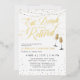 Elegante y blanca y dorada Comida, Bebida y retiro invitación con luces de cuerda, estrellas y bengalas, flautas de champán contra un fondo blanco con detalles de Relieve metalizado dorado. Invitar a tus amigos, familiares y compañeros de trabajo a una noche de celebración de tu retiro con estas glamorosas invitaciones de retiro en blanco con flautas de champán aferrándose y mágicas luces de cuerdas! Comer, beber y retirarse en Relieve metalizado dorado con luces de cuerda, estrellas, bengalas y burbujas de champán también en Relieve metalizado dorado.