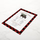 Ilustracion de un bisonte con un árbol de Navidad sobre un fondo blanco con un borde de manto rojo y negro de búfalo.