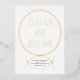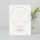 Esta hermosa invitación a la boda presenta un diseño contemporáneo con un marco dorado. Dentro del marco, los nombres de la pareja se muestran con un fondo blanco. Al lado del marco hay dos semicírculos superpuestos que se parecen a un tapón de alambre para añadir encanto. La parte trasera de la invitación tiene un toque sofisticado con los nombres de la pareja mostrados elegantemente en diagonal en oro sobre blanco.