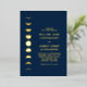 Añada un toque de elegancia cósmica a su evento con nuestra invitación a Relieve metalizado Boda Celeste. Sumérjase en la encantadora sencillez de nuestro diseño, reflejando la magia fascinante de los cuerpos celestes. Nuestro diseño moderno y atemporal muestra una serie de fases lunares representadas artísticamente en Relieve metalizado de oro real sobre un llamativo fondo azul marino. Este toque de oro le da un toque de calidez y encanto a la fresca base azul de medianoche, reforzando aún más el atractivo acogedor de la pieza. El diseño mantiene un enfoque minimalista, permitiendo que los elementos celestes brillen de verdad. Puede personalizar fácilmente para adaptarlo a sus necesidades, asegurándose de que cada pieza repite su estilo único.