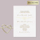 Anuncia tu día especial con esta elegante invitación de boda blanca, que muestra un diseño clásico acentuado por un corazón de cuerda de oro con lámina dorada romántica. Su estética simple, moderna y minimalista se complementa perfectamente con una delicada caligrafía, lo que la convierte en la elección perfecta para una celebración atemporal. Ideal para parejas que aprecian la sofisticación en su papelería de boda.