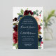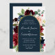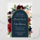 Nuestra invitación de boda Radiant Bloom rodea los detalles de su día especial con un arco de flores de acuarela pintadas en marsala borgoña, rosa sonrojado y azul marino, con follaje botánico verde y hojas de eucalipto. Una hermosa elección en colores lujuriosos y saturados para bodas de otoño o invierno, con borde de pan de oro de lujo.