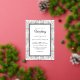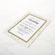 El diseño presenta un elegante borde de viña frondosa con lámina de oro sobre un fondo blanco. El diseño combina una elegante letra script y texto serif.