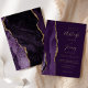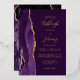 El borde izquierdo de esta elegante y moderna invitación a la boda incluye un borde de ágata color morado adornado con un falso purpurina de oro. El texto del personalizable combina la escritura a mano, el copperplate y los tipos de letra cursiva en Relieve metalizado oro real sobre un fondo violeta profundo. El reverso presenta un diseño de agate morado y dorado a juego.