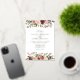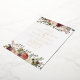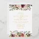 Elegantes invitaciones florales a bodas o bodas de otoño o invierno presentan sus detalles en lujosas letras de Relieve metalizado dorado acentuadas por los bordes superior e inferior de rosas acuarelas, mamáes y vegetación en colores rústicos de otoño que incluyen melocotón, marfil, rubor, burdeos y verde. Las tarjetas se revierten a un cableado profundo sutil.