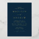 Invitación minimalista y moderna a la boda con los detalles de su boda en letras de Relieve metalizado dorado con acentos caligráficos. El fondo marino puede cambiarse a un color de su elección. La parte posterior de la invitación a la boda del Relieve metalizado muestra su foto de compromiso vertical. Diseñado para coordinar con nuestra colección de bodas Modern Elegance.