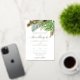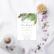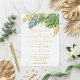 Esta elegante invitación a la boda presenta un diseño acuático de exuberantes hojas tropicales en tonos verdes. Las hojas se acentúan con Relieve metalizado dorado, lo que aporta un toque de lujo. El texto está impreso en un elegante guión de caligrafía de Relieve metalizado dorado, que es fácil de leer en el fondo blanco. Esta invitación es perfecta para un boda de verano o una boda de destino en un lugar tropical.