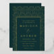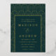 Elegante invitación a bodas de arte deco con un patrón de arco de Relieve metalizado dorado con un fondo verde esmeralda. Personalice las invitaciones de boda modernas con sus nombres y detalles bodas en letras de Relieve metalizado dorado.