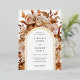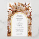 Invitación al Relieve metalizado Boda Botánico Caída. Esta elegante y rústica invitación a la boda en el marco de un Relieve metalizado dorado, con naranja y hojas de terracota pintadas a mano, dahlias crema y beige, y hermosos rosas de color rojizo, ideal para un boda otoño o otoño. La parte trasera de la invitación tiene un fondo blanco sencillo con un ramo de coordinación y un monograma de boda.