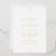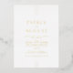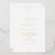 Esta invitación a la boda de Relieve metalizado dorado de la Everly Collection presenta un diseño blanco minimalista con líneas de deco de arte delgadas y un cálido tipo oro. El diseño centrado y el espaciado generoso proporcionan un aspecto moderno y refinado. Las líneas de texto y deco se realizan en un lujoso Relieve metalizado dorado prensado.